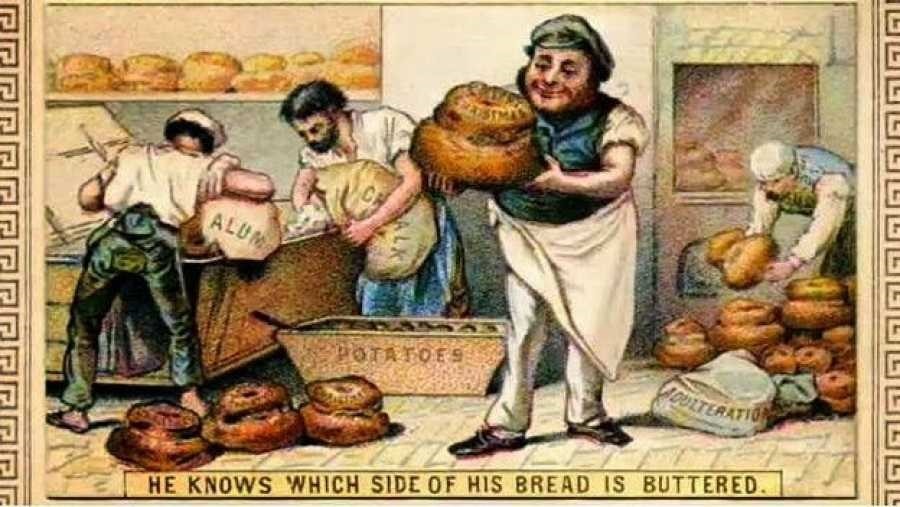 Los empresarios victorianos aprovecharon la circunstancia para añadir volumen y peso a su pan sacando tajada sustituyendo la harina por yeso, huesos animales triturados, tiza o alumbre.